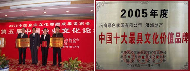 第五屆中國企業文化論壇暨2005年中國企業文化論壇成果發布和表彰大會于2005年11月12日在北京西苑飯店隆重舉行,全國政協常委、國務院國資委領導和數百名優秀企業代表、新聞媒體等出席了大會,在本屆大會上沿海集團之“沿海地產”以創新的“健康、綠色、生活藝術空間”為特征,和以沿?;痉楹诵牡?、經歷十五年積累形成的企業文化,榮獲了“2005年中國十大最具文化價值品牌”,而且是全國房地產行業中唯一獲此殊榮的企業。在本次論壇上沿海集團北京高盛總經理胡斌代表企業發表了《企業品牌標識創新是企業新的文化品牌理念》的學術演講,在演講中突出介紹了沿海集團的企業文化和價值理念,使沿海集團受到論壇的高度關注。