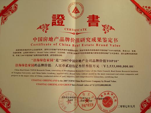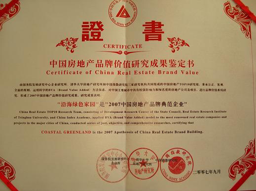 2007年9月22日,2007中國房地產品牌價值研究成果發布會在北京釣魚臺國賓館隆重舉行。在新鮮出爐的第四屆“中國房地產公司品牌TOP10”榜單上,沿海集團(以下簡稱“沿海地產)再一次榜上有名,這也是沿海地產連續四次蟬聯此項榮譽。