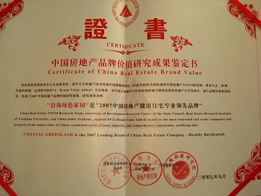 在這次“2007中國房地產公司品牌TOP10”的光榮榜上,沿海地產獲得“2007中國房地產公司品牌價值TOP10”、“2007中國房地產品牌典范企業”及“2007中國房地產專業領先品牌--健康住宅”等榮譽;沿海·賽洛城和麗水系列項目品牌雙雙躋身“2007中國房地產項目品牌價值TOP10”稱號。企業品牌和項目品牌同時獲獎,充分證明沿海集團的健康地產追求和項目品牌建設得到了共同認可。
