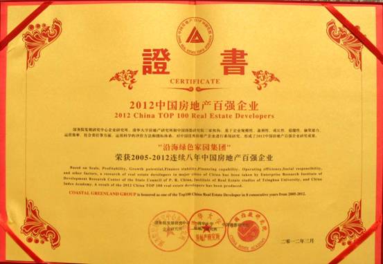 2012年3月23日,由國務院發展研究中心企業研究所、清華大學房地產研究所和中國指數研究院三家單位共同主辦的 "2012年中國房地產百強企業研究成果發布會" 在北京釣魚臺國賓館舉行。沿海綠色家園集團自2005年起,連續八年榮膺“中國房地產百強企業稱號”,百強排名名列第42位。