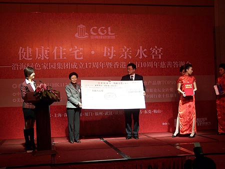 鮮花,香檳,掌聲雷動。2007年11月16日,中央委員、全國婦聯副主席、書記處第一書記黃晴宜女士代表千百萬個干旱缺水地區的人民,從沿海地產吳欣總裁手中接過了其捐贈的300萬人民幣的支票,并由此宣告“健康住宅·母親水窖”沿海與業主共建綠色家園大型捐助行動邁入一個新的歷史階段。