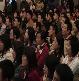 晚上6點多參加宣講會的同學們陸續到達清華現場,領取宣傳材料和贈送品。宣講會正式開始時,能夠容納300多人的多功能廳里面已經是座無虛席,人聲鼎沸了,連大廳的后排都站滿了熱情的同學們。