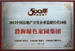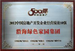 2012年3月21日,由中國(guó)房地產(chǎn)研究會(huì)、中國(guó)房地產(chǎn)業(yè)協(xié)會(huì)、中國(guó)房地產(chǎn)測(cè)評(píng)中心三家單位聯(lián)合主辦的 "2012中國(guó)房地產(chǎn)開發(fā)企業(yè)500強(qiáng)" 測(cè)評(píng)活動(dòng)在北京國(guó)貿(mào)三期舉行測(cè)評(píng)成果發(fā)布會(huì)。《2012中國(guó)房地產(chǎn)開發(fā)企業(yè)500強(qiáng)測(cè)評(píng)研究報(bào)告》顯示:沿海綠色家園集團(tuán)入選2012年中國(guó)房地產(chǎn)開發(fā)企業(yè)50強(qiáng),全國(guó)排名排名第45位,并榮獲 "中國(guó)房地產(chǎn)開發(fā)企業(yè)穩(wěn)健經(jīng)營(yíng)10強(qiáng)" 和 "中國(guó)房地產(chǎn)開發(fā)企業(yè)經(jīng)營(yíng)績(jī)效10強(qiáng)" 兩個(gè)單項(xiàng)榮譽(yù)。