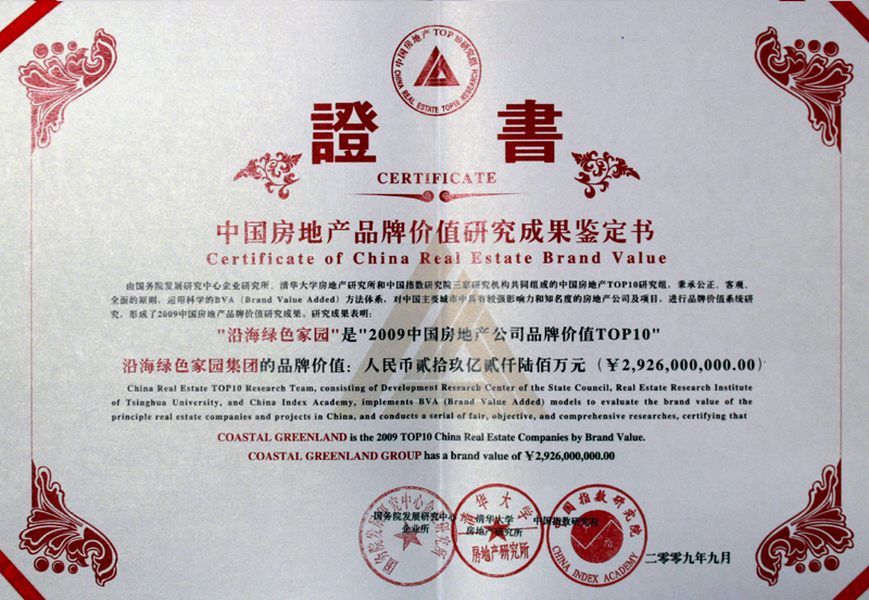 沿海集團以持之以恒的品牌建設和責任領跑的持續創新,榮獲2009年度中國房地產品牌價值TOP10。這是沿海集團連續六年獲此殊榮。