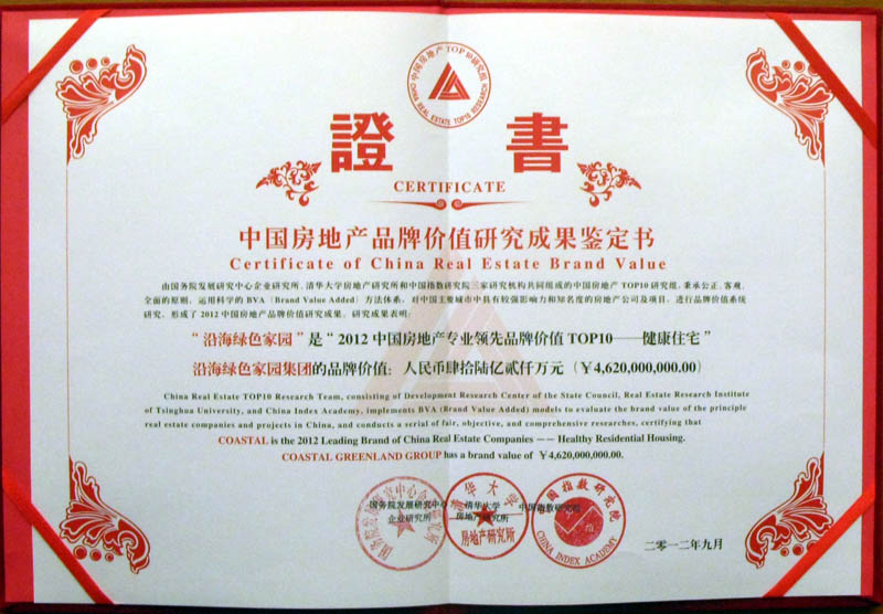 2012年9月6日,2012中國房地產品牌價值研究成果發布會在北京召開,沿海綠色家園集團(以下簡稱沿海集團)憑借持之以恒的品牌建設,以及對“健康住宅”的堅持和戰略推動,以46.2億元的品牌價值連續九年蟬聯“中國房地產品牌價值TOP10”,其中品牌價值較2011年的42.07億提升近10﹪。