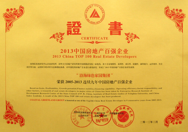 2013年3月29日,由國務(wù)院發(fā)展研究中心企業(yè)研究所、清華大學(xué)房地產(chǎn)研究所和中國指數(shù)研究院三家單位共同主辦的"2013年中國房地產(chǎn)百強企業(yè)研究成果發(fā)布會"在北京釣魚臺國賓館隆重舉行,沿海綠色家園集團連續(xù)九年榮膺“中國房地產(chǎn)百強企業(yè)稱號”,且連續(xù)九年排名百強50名內(nèi)。