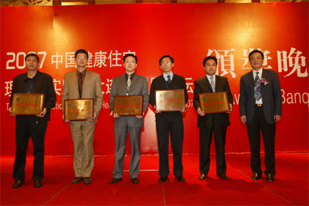 會上,國家住宅工程中心仲繼壽主任宣讀06-07年健康住宅新批試點項目名單。沿海綠色家園(武漢)有限公司、北京世紀正源房地產開發有限公司等幾家企業的建設項目通過了國家住宅中心的資格審批,劉燕輝主任在頒獎典禮上,向獲獎單位頒發了試點工程證書和獎牌。