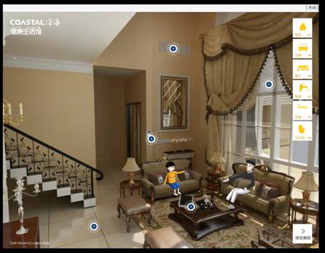 新官網改版的最大的亮點是網絡3D版“健康生活館”的正式發布。“健康生活館”以家庭生活的小環節為串聯節點,從“庭院”、“客廳”“廚房”“臥室”“洗手間”等五大生活空間,集中呈現了沿海健康住宅技術系中的20余項的主要技術運作原理及相關運營參數,訪問者可直觀地感受健康住宅技術如何讓生活更美好。