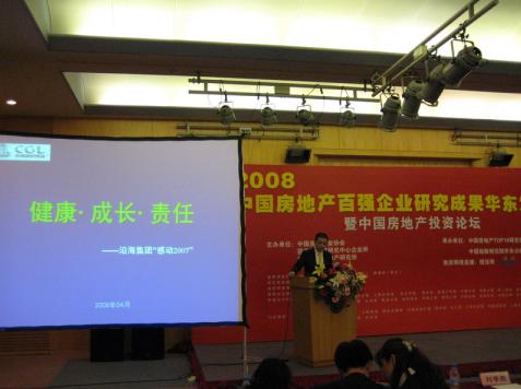 中國國際貿易促進委員會建設行業分會會長(原建設部國際合作司司長)龔滬生先生為此次華東發布會致開幕辭,高度評價2008中國房地產百強企業研究的意義。中國房地產TOP10研究組辦公室主任兼中國指數研究院常務副院長黃瑜女士發布“ 2008中國房地產百強企業 ”研究報告,沿海集團榮膺“2008中國房地產百強企業”。