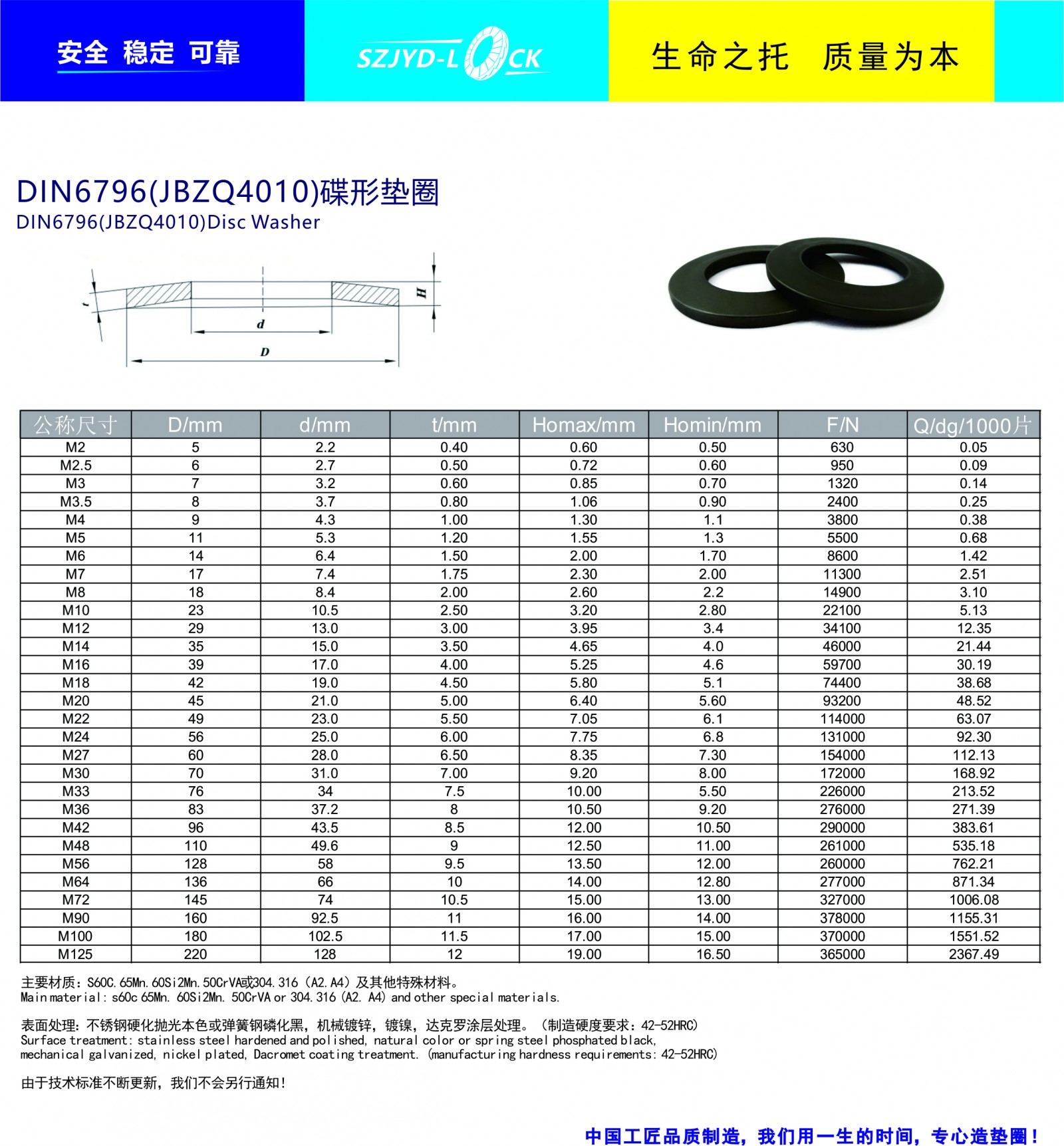 制造執(zhí)行標(biāo)準(zhǔn):符合DIN6796標(biāo)準(zhǔn)。規(guī)格:M2-M125型號,也可提供訂制服務(wù)主要材質(zhì)有S60C,60Si2mn,51crav4及特殊合金材質(zhì),鹽浴硬化,表面處理為磷化黑,機(jī)械鋅,達(dá)克羅涂層等!不提供化學(xué)電鍍處理!多數(shù)情況下標(biāo)準(zhǔn)型碟形彈簧墊圈并不能完全滿足用戶要求,通過計算與適當(dāng)調(diào)整來獲得理想的訂制功能!