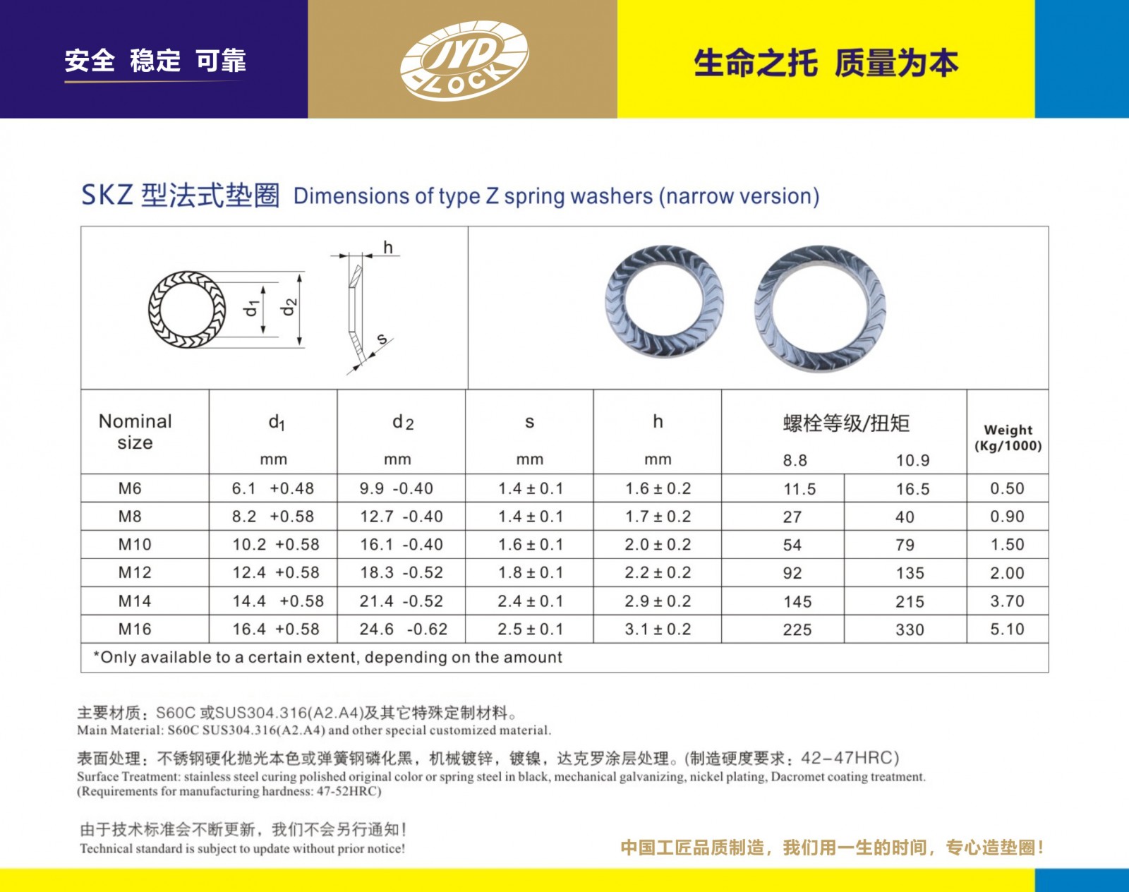 執行制造標準:SKZ鎖緊墊圈規格:M6-M16為標準型號 ,根據客戶需求可提供訂制 主要鋼質:SUS304.316、A2.A4及超級不銹鋼等 硬化等級:HV350 符合10級強度。硬化拋光表面處理, 經有效測試800小時以上 完全符合歐盟ROHS標準、