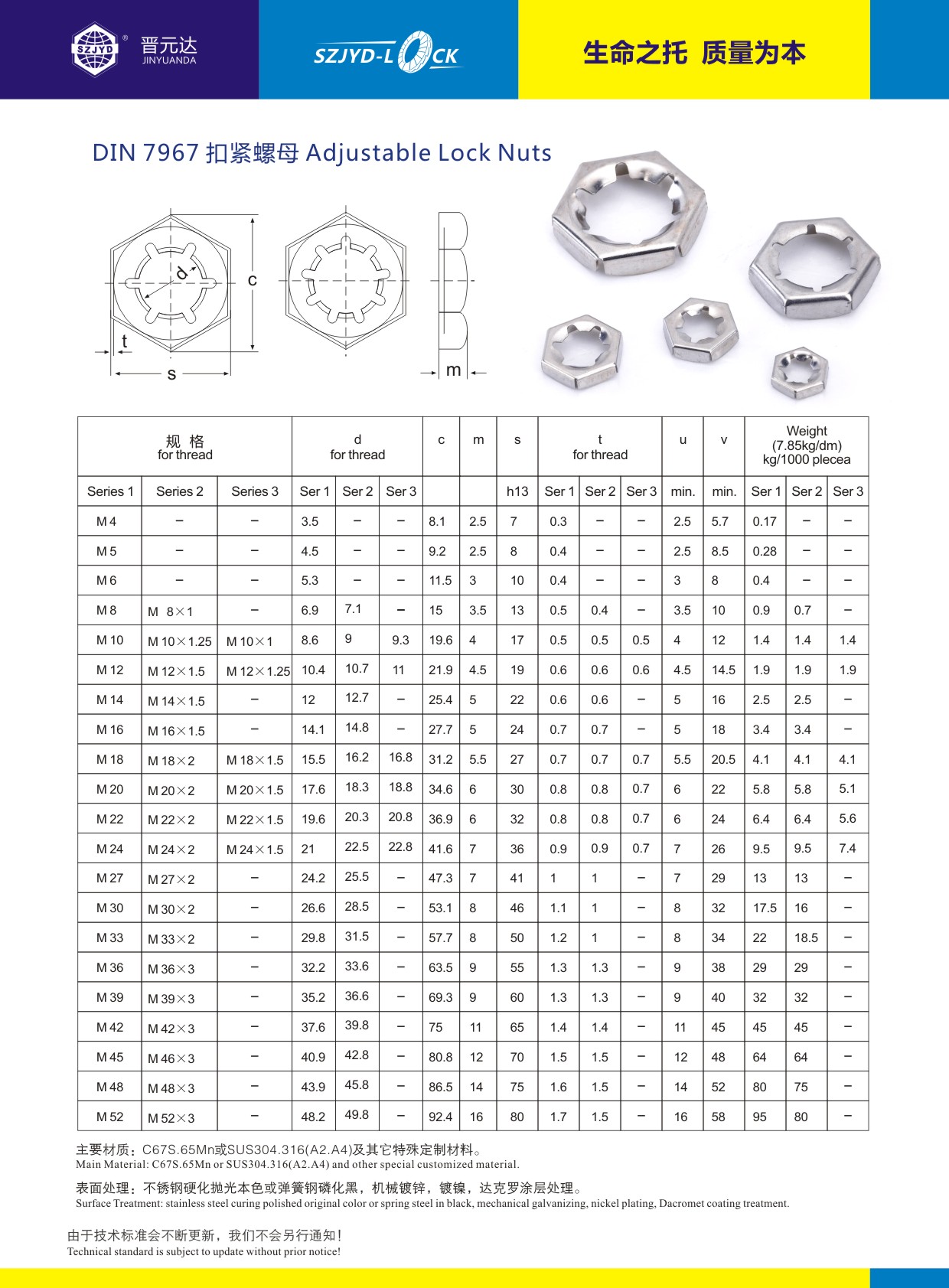 德國標準DIN7967扣緊螺母,SUS304/SUS316不銹鋼扣緊螺母/等換EN1.4401/EN1.4301不銹鋼扣緊螺母/級進模沖壓生產工藝,為了保證扣緊螺母的鎖緊性能,SZJYD品牌扣緊螺母的不銹鋼材質都在進行彈性硬化處理!